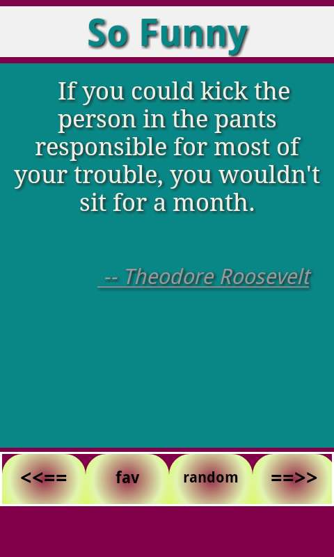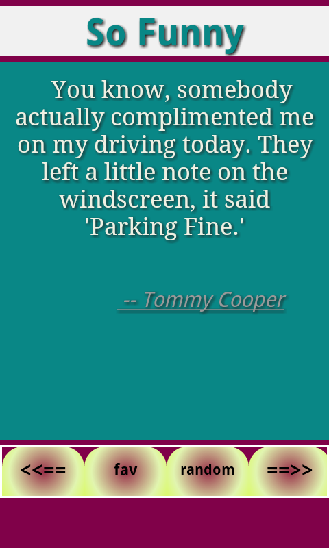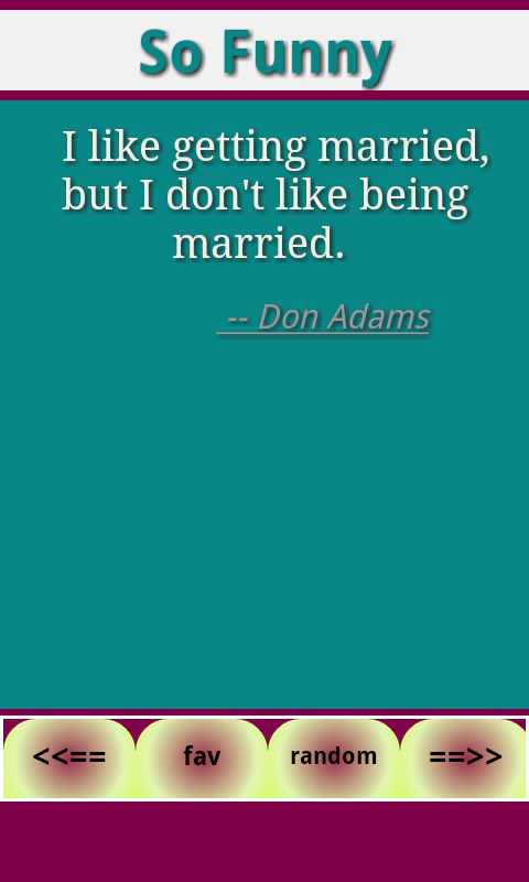 This application has wonderful collection of funny quotes and jokes. You could store your favorites, view them later using the "View Favorites" menu button. You could clear your current favorites using the "Clear Favorites" menu button. You could share jokes with your loved ones by clicking on "Share Fun" menu button. You could send your own funny messages which you like and they shall be added into this app by clicking on "Add My Joke" button.