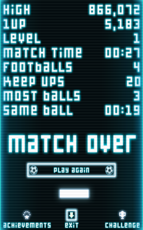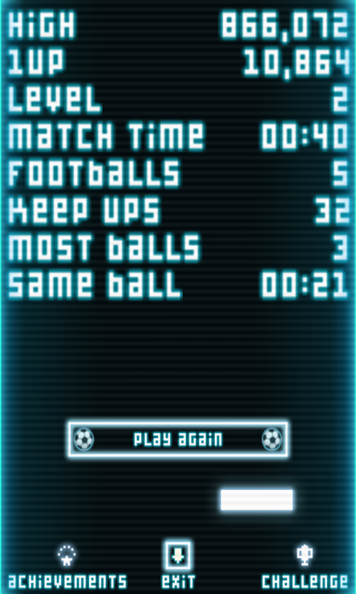 BRAND NEW FOOTBALL CHALLENGE WITH HUNDREDS OF ACHIEVEMENTS TO KEEP YOU BUSY DURING HALF TIME AND BETWEEN MATCHES.CHALLENGE YOUR FRIENDS HEAD TO HEAD FOR BRAGGING RIGHTS.