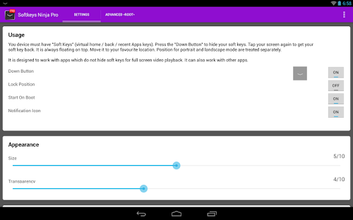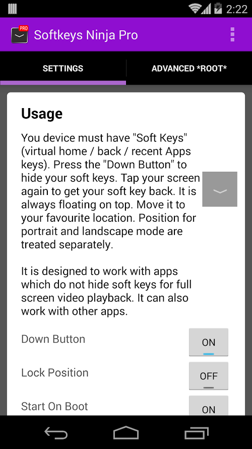 We watch video everyday. Some of video streaming apps is do not hide soft keys (home / back / recent apps key) during full screen video playback. It is very annoying and disturbing. The app add a "Down Button" for selected apps. Users can press this button to hide the soft keys, and enjoy truly full screen video playback.