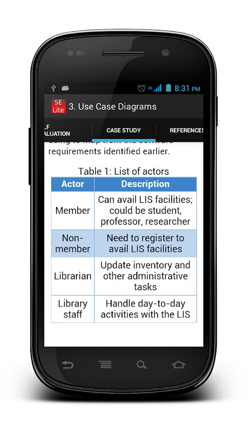 This app is a valuable companion for students taking Software Engineering courses. It is a helpful guide for self-study covering basic concepts in Software Engineering. If you are studying the subject for the first time and looking for a Software Engineering tutorial for beginners or want a quick refresher, this is an useful resource. This is not merely a typical Software Engineering tutorial, but comes with MCQs and detailed case study on a typical library information system. So, take your time and learn at your own pace. And keep learning the software engineering fundamentals, methodologies and principles of software design even on the go!