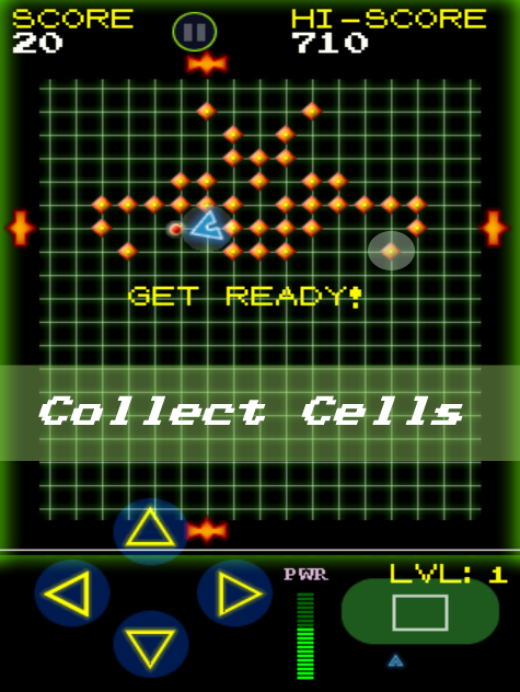 Aliens are shooting at your ship in this fast arcade classic arcade game. True classic space arcade style action on a grid. Collect all the cell pac items to escape.