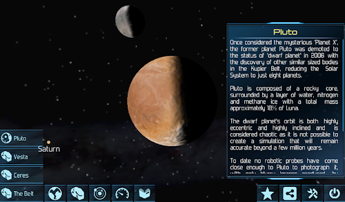 In this solar system simulator you can explore the brilliant blue-green Uranus, knocked onto its side by a massive collision. Visit the proto-planet Ceres which makes up one third of the mass of the asteroid belt. Marvel at Neptune's moon Triton which orbits in the opposite direction to Proteus. Take in the sights of the Jupiter's heavily scarred moon Callisto, its surface pockmarked by countless impact craters.