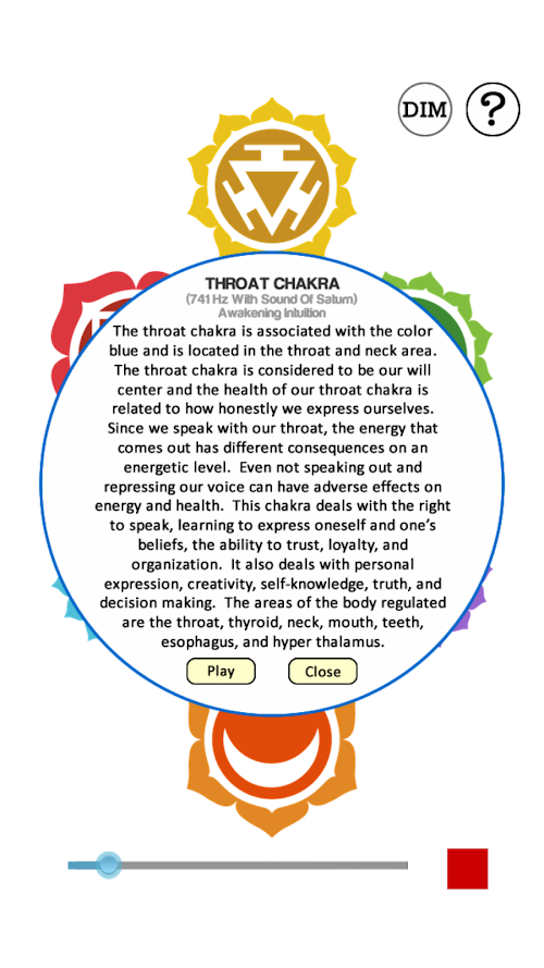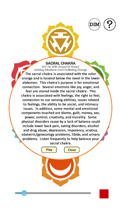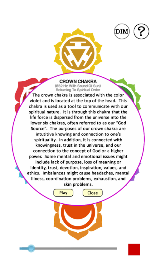 This app uses the Solfeggio scale. This ancient scale is part of a 6-tone sequence of electro-magnetic frequencies called the Original Solfeggio Scale. These particular frequencies were rediscovered by Dr. Joseph Puleo in 1974. The 6 tones were then manifested into tuning forks. The hertz are at which the forks vibrate to balance your cells. This app emulates the sound of those tuning forks and aim to stimulate and balance each chakra that correlates with each on of the tones.