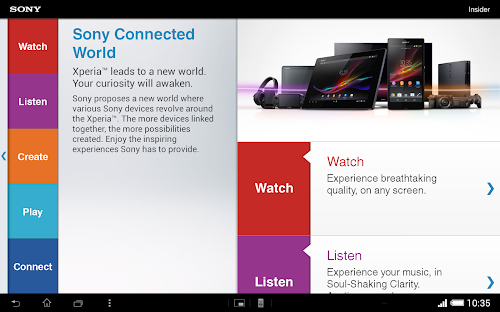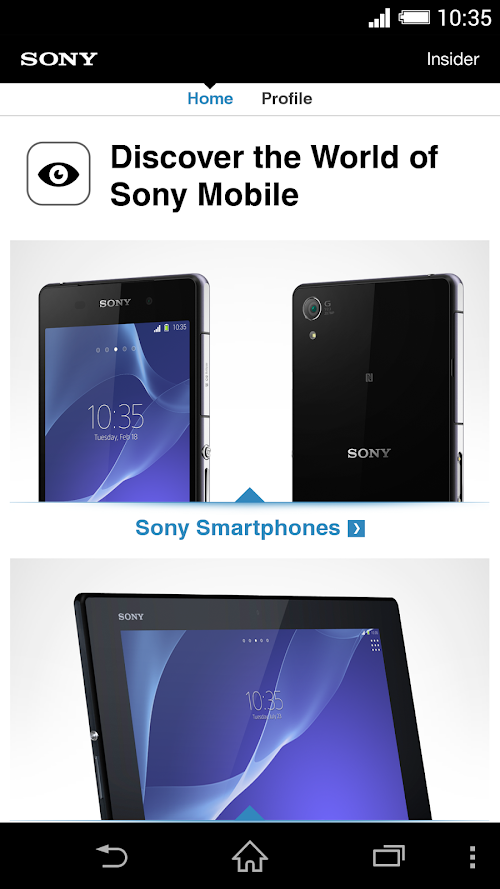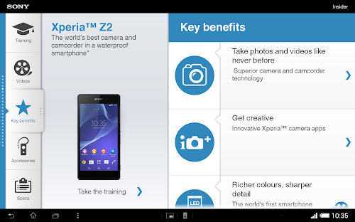 Charged with product info, videos and trainings: get the Sony Xperia™ Insider app on your Android™ device. Find out all about Sony's latest Xperia™ smartphones and tablets and enjoy all product images, videos and trainings in razor sharp quality thanks to Full HD display support.