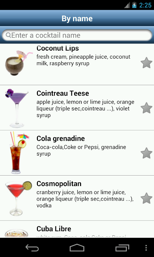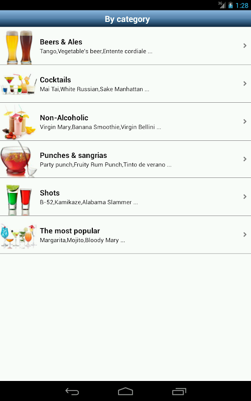There are many ways to search for an appropriate drink. You can browse and search for recipes inside the Cocktails option by name, category, ingredients or by colors.
