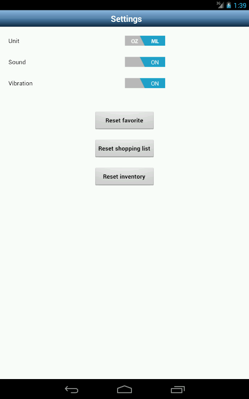 You have options to choose the metric or imperial units for all the drinks recipes in the settings menu. You can also reset the inventory and shopping list in the settings option.
