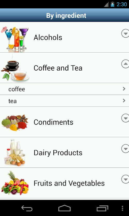 You can select recipes through various ingredients like alcohols, condiments, dairy, coffee and tea etc.