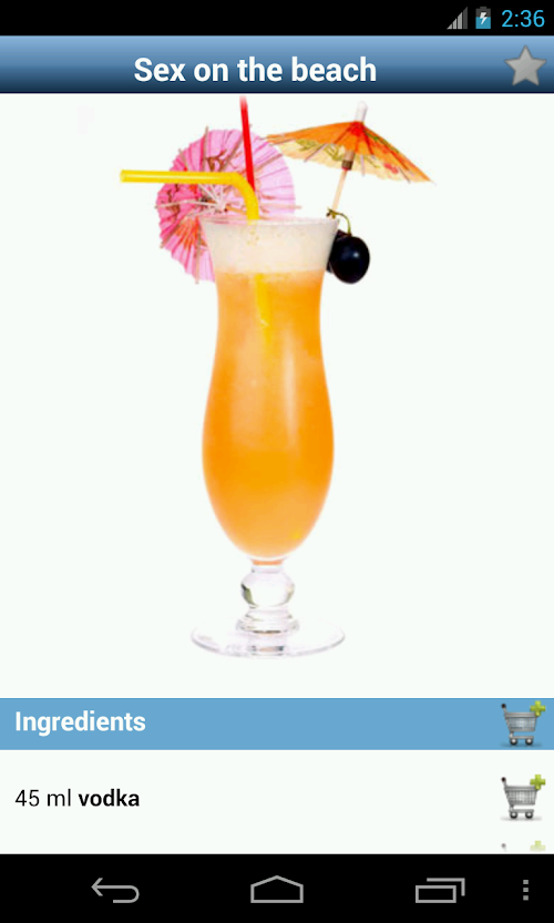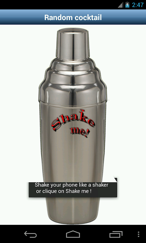 The "Random Cocktail" function is simple and funny, which lets you find a random drink recipe. Take you mobile in your hands, shake it and enjoy.