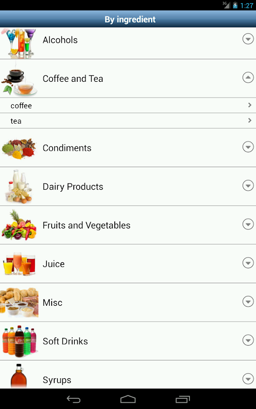 You can select recipes through various ingredients like alcohols, condiments, dairy, coffee and tea etc.