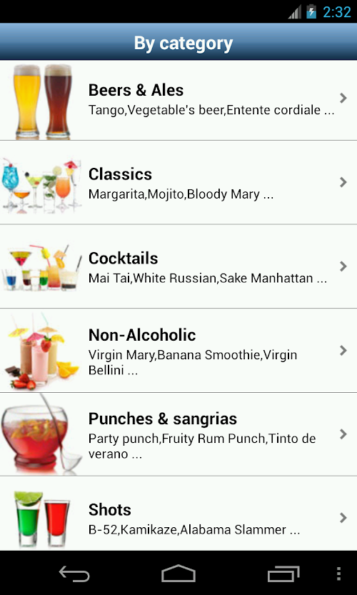 There are many ways to search for an appropriate drink. You can browse and search for recipes inside the Cocktails option by name, category, ingredients or by colors.