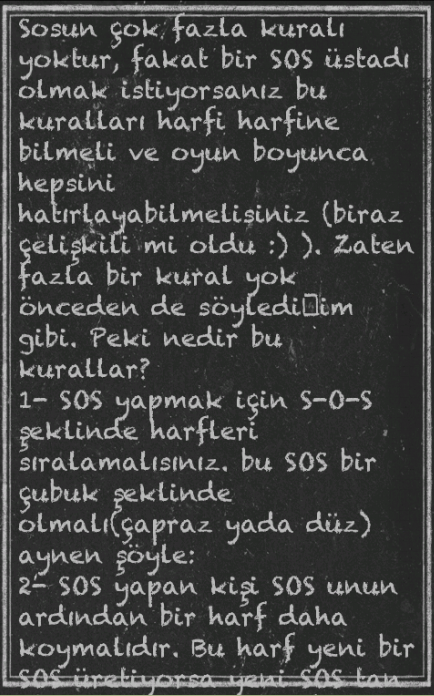 SOS game you can play alone or with friends relish a game is fun and instructive. I used to book with pencil on the chalk board or SOS played on phones and tablets for now. You will not ever get tired of playing this game. SOS does not have too many rules of the game, but if you want to master an SOS to the letter of these rules you should know and be able to remember all of them throughout the game (it was a bit contradictory :)). As I already said before no one rule. So what are these rules?