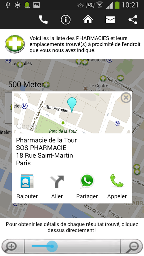 Une fois la pharmacie choisie, vous pouvez voir son itinéraire, ou bien partager ces informations.