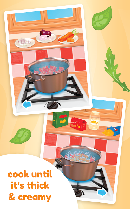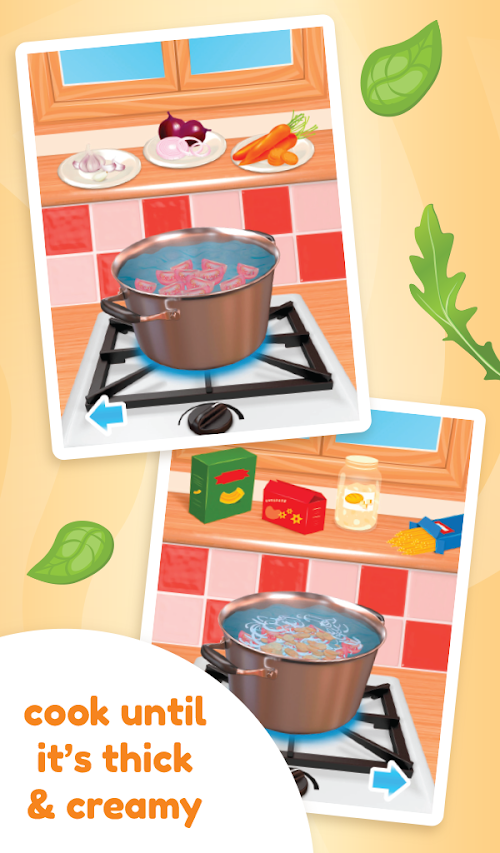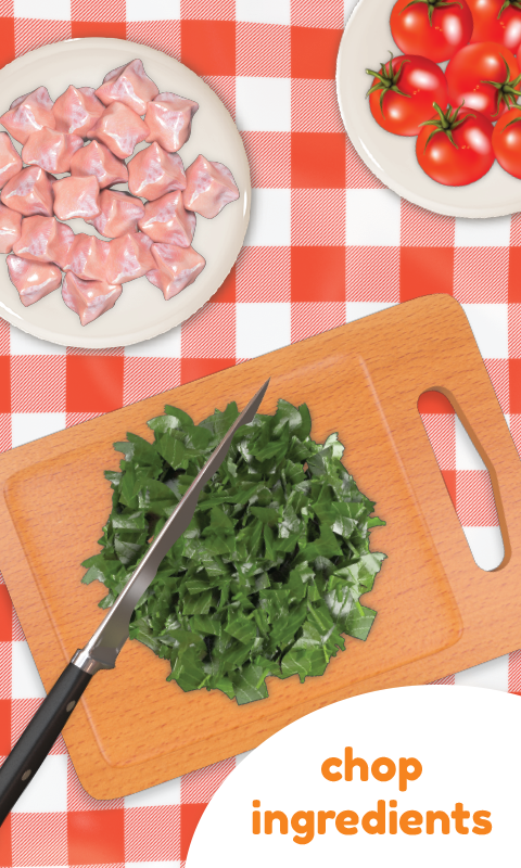First select a recipe from the cooking menu: chicken, mushroom, tomato or spinach soup. Then chop all the ingredients and place them in the cooking pot. Add other colourful vegetables from your garden and spice the soup with a tiny pinch of salt and pepper if you think it needs it.