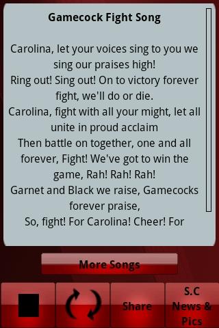Experience the explosive power of South Carolina Gameday! Play the top Gamecock fight songs whenever & as LOUD as you want; at the pregame party, during the game, after a score, celebrate a victory, or taunt a rival. Includes MUSIC & LYRICS for “Step to the Rear”, “USC Alma Mater”, "Gamecock Fight Song", "Go Carolina" & top USC logos. All content is officially licensed. Easy sharing link to friends on Facebook. It’s like bringing the band & cheerleaders with you! GO GAMECOCKS!