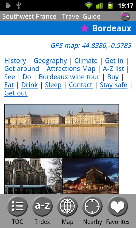 4. Bordeaux: Attractions Map | History | Geography | Climate | Get in | Get around | See | A-Z list | Do | Buy | Eat | Drink | Sleep | Contact | Stay safe | Get out | Bordeaux wine tour