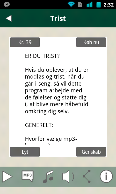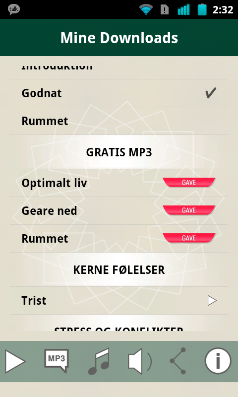 There follows a free relaxation hypnosis "Good night" with your download. You can later buy other selvhypnoser directly from the application. Prices for these is 99 kr.