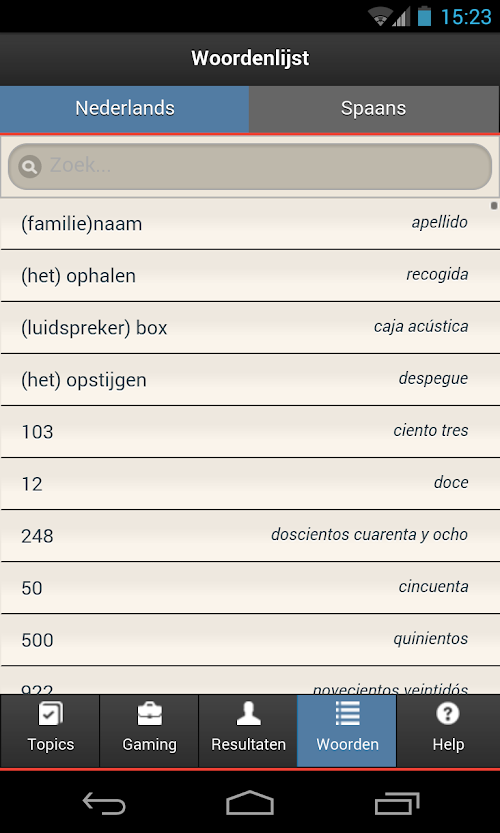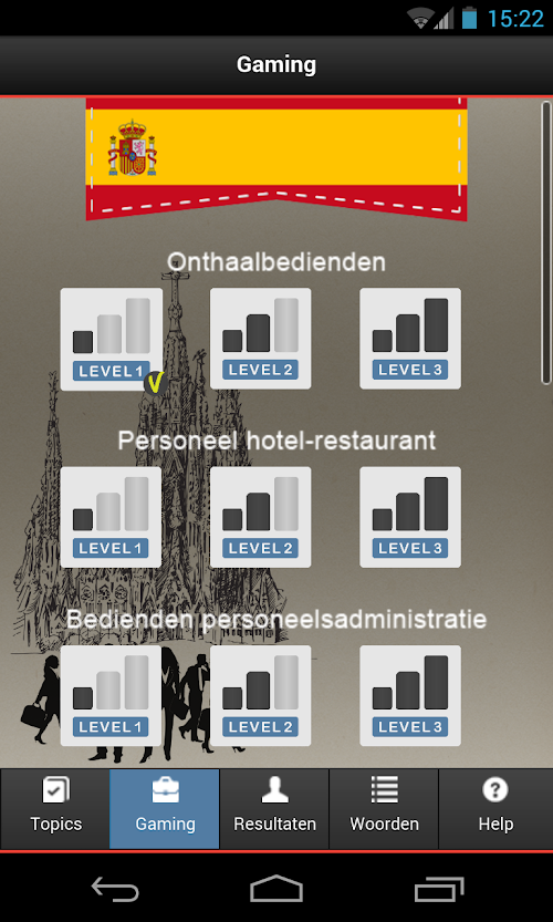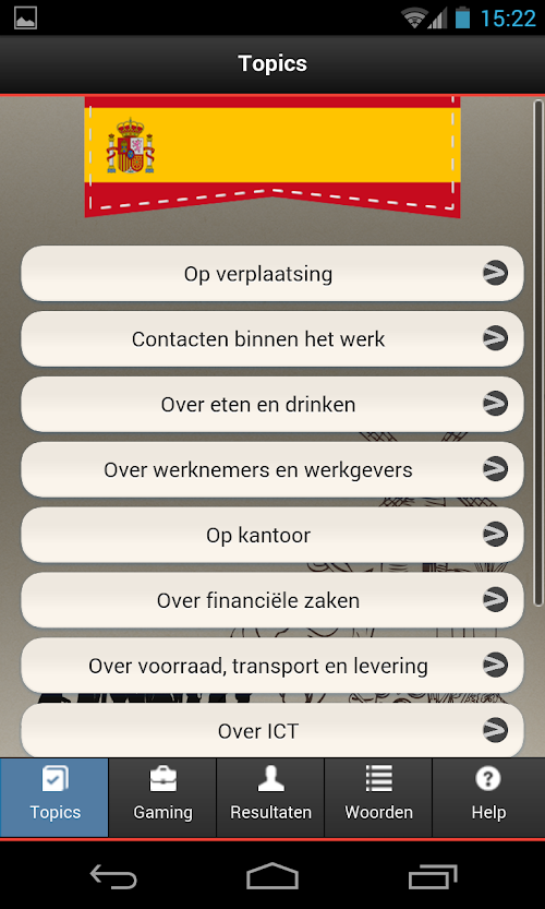 Je krijgt bovendien een woordenlijst als handig hulpmiddel én je kan jezelf testen met een game. Je resultaten kan je delen op facebook.This app is intended for Dutch speakers who want to improve. Their professional vocabulary in Spanish