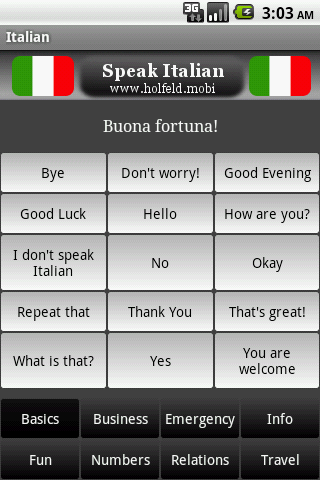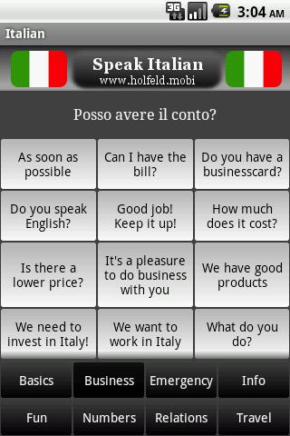 SPEAK ITALIAN has all the phrases recorded for you. Accessible with just one button click. ANYTIME! ANYWHERE!