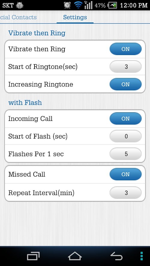 2) when incoming call that special contacts, it will notice you with ringtone and flash