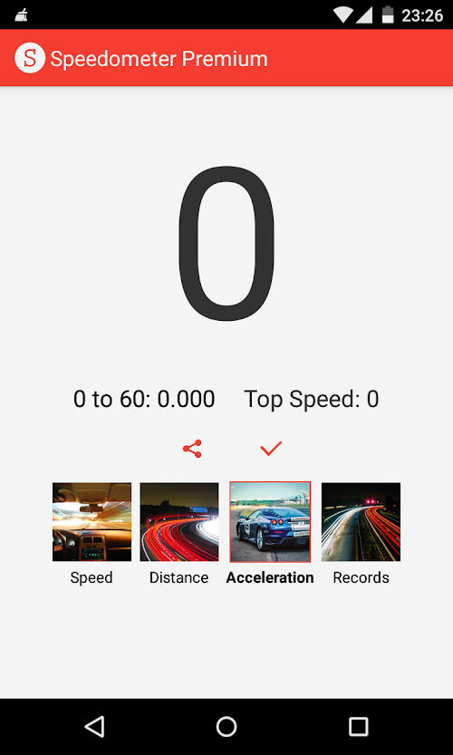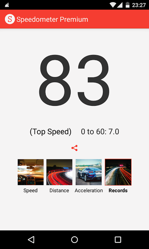 A premium speedometer application that presents the current speed, simply and easily readable at a glance, along with an intelligent 0 to 60 timer that once started will wait until the vehicle pulls off before starting and will automatically stop once 60 mph is reached. Distance tracking is another clever feature along with a very useful records keeping, where the top speed and quickest 0 to 60 mph is logged.
