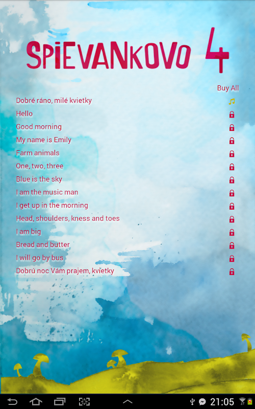 The new application is again playful, will the songs, entertainment and children with him will be able to learn something in English. Spievankovo is a country where, in addition Spievanky Zahrajka a lot of lives and other characters. And this series of clips you want to introduce a Fairy Nezábudka whose mission is to wake up in Spievankovo Zajka flowers and smiley, who likes to travel. And just Smejko Bunny wants to take a trip to England. But does not speak English. So Fairy Nezábudka calls to Spievankovo his English friends to Zajka smejkal learned a playful and cheerful form of English and sing along to. Despite the fact that this is a "funny English", the story is conceived to be suitable for the same age bracket as were previous stories.