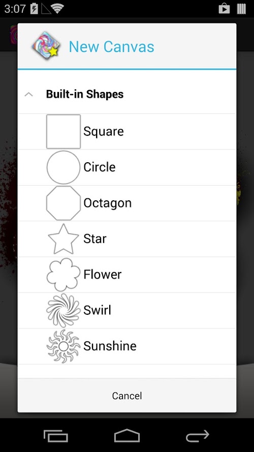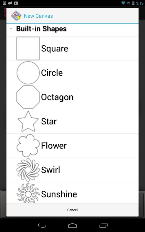 SpinArt features a large palette of 54 colors, 3 brush sizes, and 7 built-in canvas shapes. You can save the image to your device's photo gallery or share it with the world via email, Facebook, Picasa, and more!