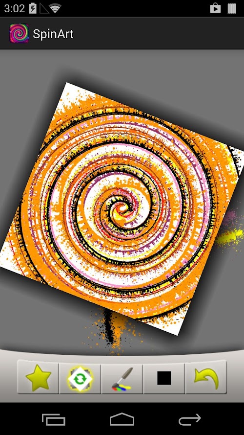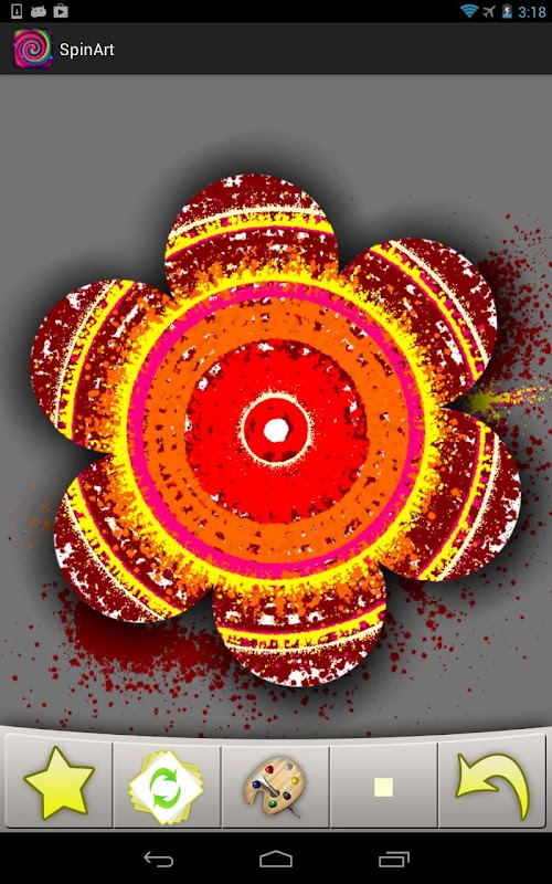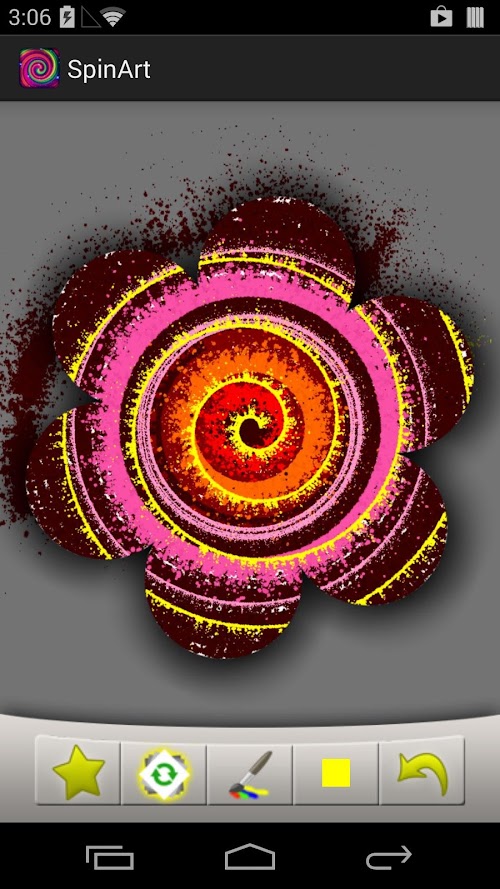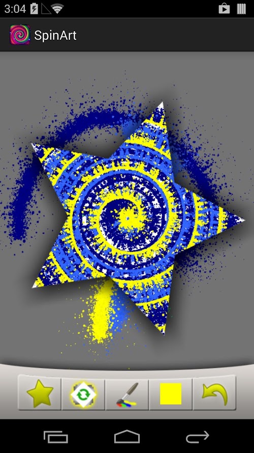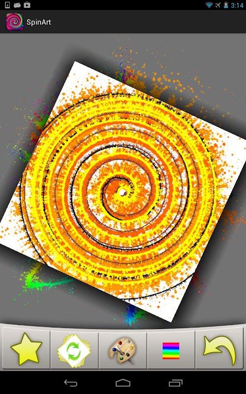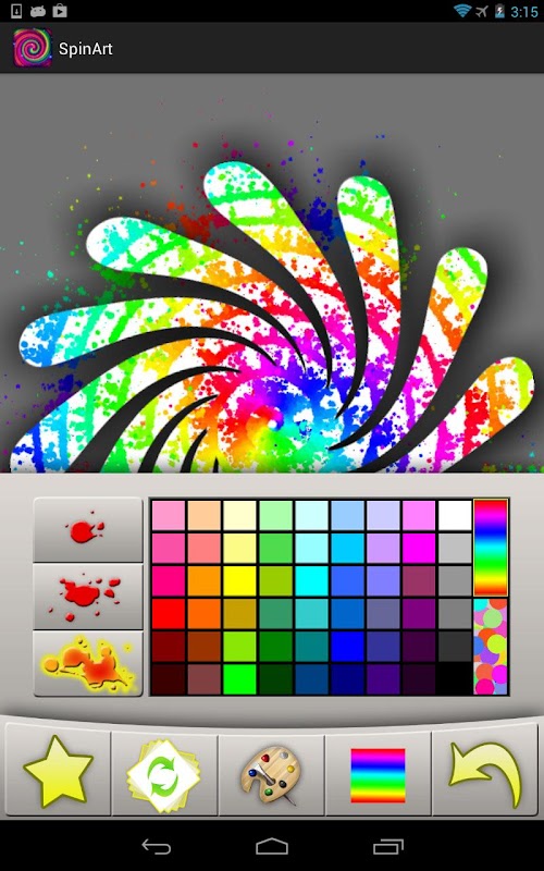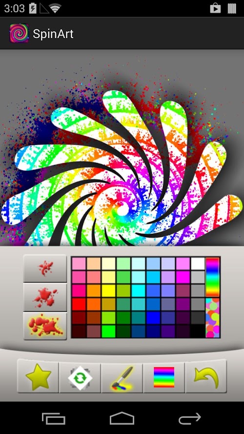 When in "Spin Mode" (the button with the green arrows on the left), swipe your fingers across the canvas to spin at varying speeds. Then switch back into paint mode (the paintbrush button), and choose from two brush sizes and a color from the palette, then use your finger to splat some paint and watch some amazing patterns emerge!