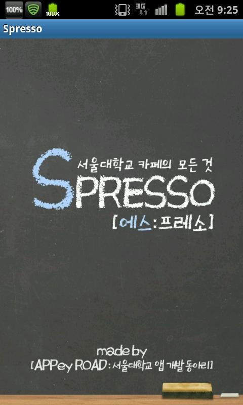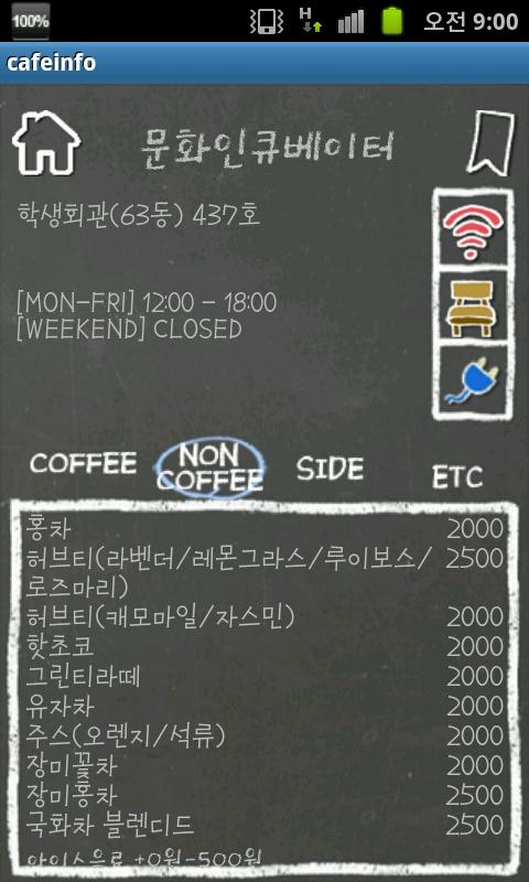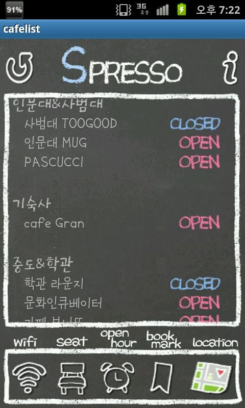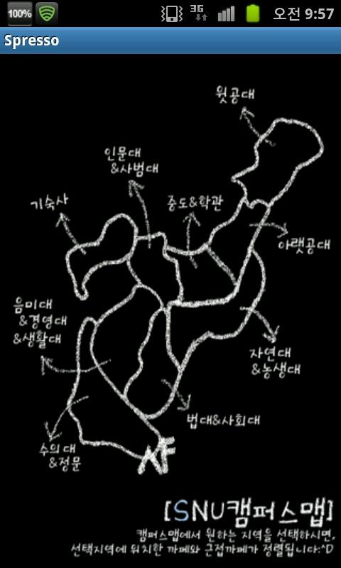 This application lets you know everything about cafes in Seoul National University, from location to menu. You can search for cafes you want by location, open hour, wi-fi availability, etc.