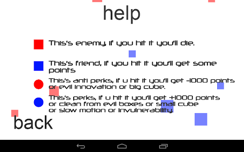 Blue square was caught between two fronts, and he needs to evade enemy squares that come from nowhere , sometimes to help him fly blue spheres that give him some kind of help on the similarity of invulnerability or deceleration for easy movement between enemies , but sometimes appear red spheres which should beware because they do completely opposite things, such as the destruction of all the blue squares and increase the number of red or increase your square to a larger size that it is unrealistic just squeeze through the enemy. Help a blue square to cope with this difficult task !
