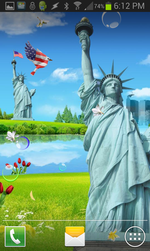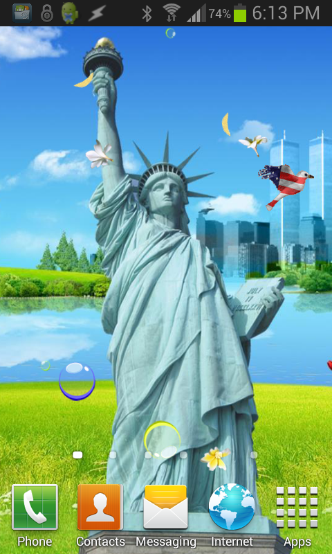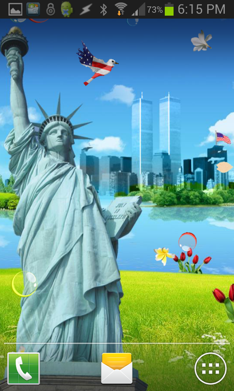 This is a beautiful high quality playable animated live wallpaper of Statue of Liberty, US. You can play with the realistic looking falling bubbles and leaves in this wallpaper, just touch them on the screen and transform them into flying birds of United States flag. It features Statue of Liberty, New York's World Trade Centre Twin Towers in the Background, Bubbles, Leaves and Birds.