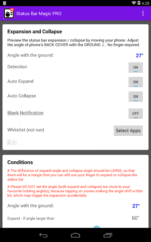 Because of the large screen size, pulling down the status bar could be tedious and difficult sometime. It can also help you to keep your screen clean because auto pull-down do not require touching of screen. If you have a large screen, you will love this app.