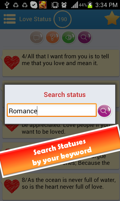 Status Message (+Love Status) is a must have app with huge collection of the best Statuses, Messages and Quotes for all occasions and your love life!