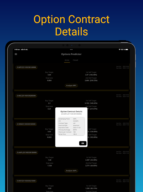 Options Predictor is a powerful tool for options traders of all experience levels. Our app uses AI-powered algorithms to scan through thousands of options contracts from American markets each day to identify those with the highest potential for short-term price increases.
