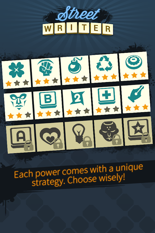 Strategy is everything. You choose the bonus you start your game with. Will you play fair and try to build the longest words, or get dirty and steal letters, plant mines or wipe the board? Each match starts with a unique ability which will give you an advantage in the game but also change your strategy.
