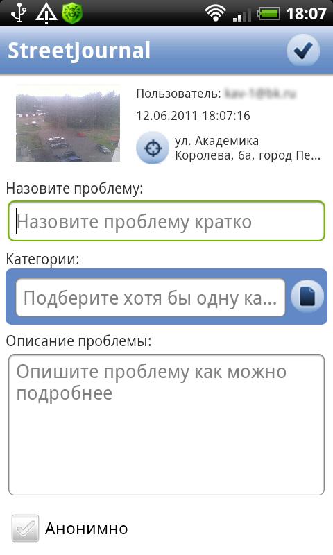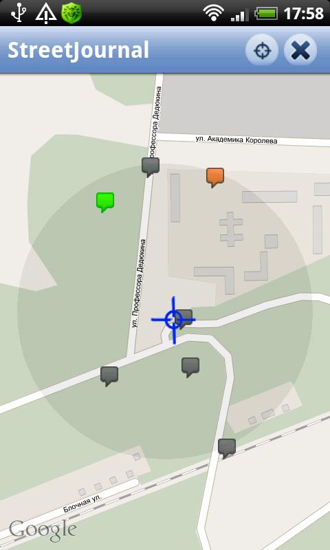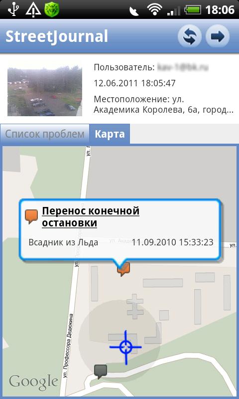 The application allows "on the fly" take a picture of the problem area and add the issue to the portal www.streetjournal.org. Location is determined by the current coordinates device. Displays the newly added or found a problem on the map Google.