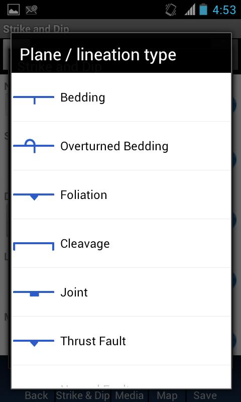 We have enabled standard symbols for various linear and planar features which include: bedding, overturned bedding, foliation, cleavage, joints, thrust and normal faults, right and left lateral strike-slip faults with or without a dip, lineation, and syncline and anticline plunge. Once the symbol has been chosen and the strike and dip recorded, the symbol(s) can be viewed immediately on a map.