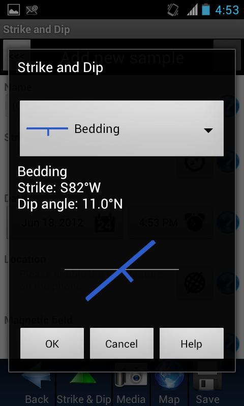 Once you have installed the application, you can use your smartphone or tablet in the same way you would use a brunton compass. You simply orient the phone or tablet along the planar or linear feature, choose a symbol, and click. The device’s built-in compass and orientation sensors instantly record the strike, the dip, and dip direction.