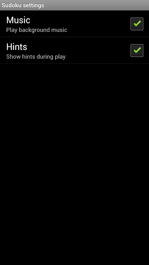 The formats of Sudoku will always be random ( In the free version there are only two diagrams). You can also enable or disable the music and suggestions.