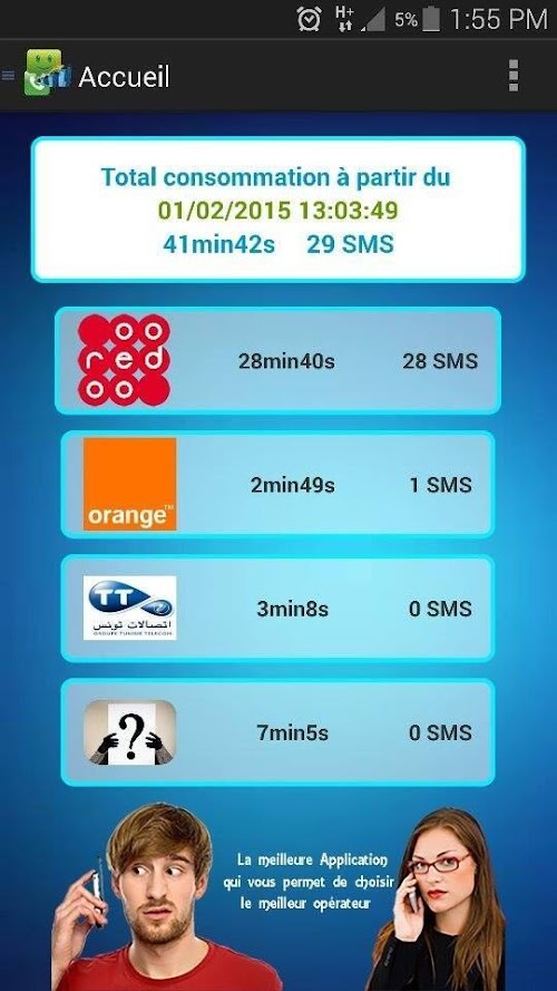SuiviConso Tunisia to monitor and save all the calls and sent sms, view the history and statistics, that let you know the best operator to use against your consumption.