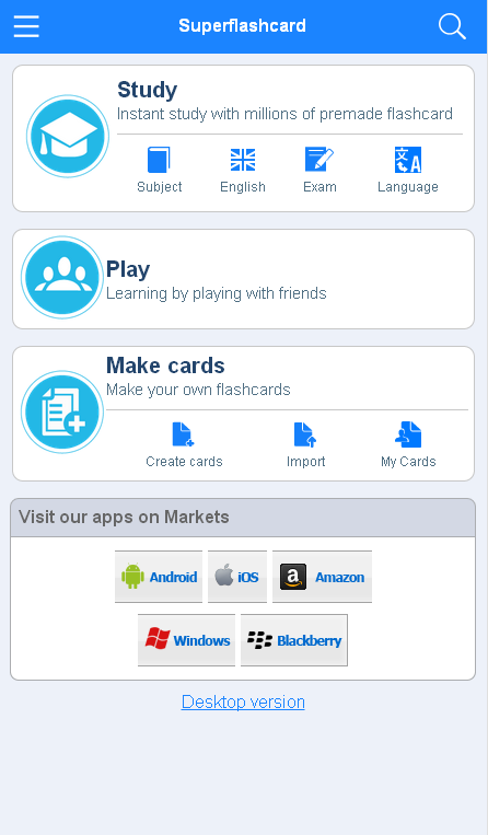 Superflashcard app includes Millions premade flashcards from 4 big categories with Thousands sub-categories :