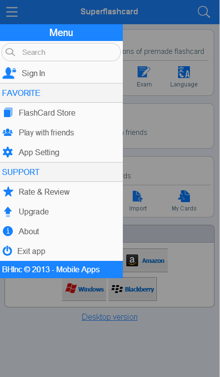 This app is also available on Apple App Store, Amazon Kindle App Store, Blackberry App Store and Windows Phone App Store. Please visit us at http://about.superflashcard.com/tour/ for more information .