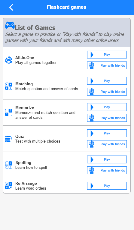 Using Flashcard will help you learn faster and remember more in a shorter time by showing flashcards just before you will forget them. Superflashcard app has several learning modes: Study, Slide show, Matching, Memorize, Quiz, Re-arrange, Spelling or All-in-One(Play all games together) to make the learning process for learning all subjects more exciting and fun.