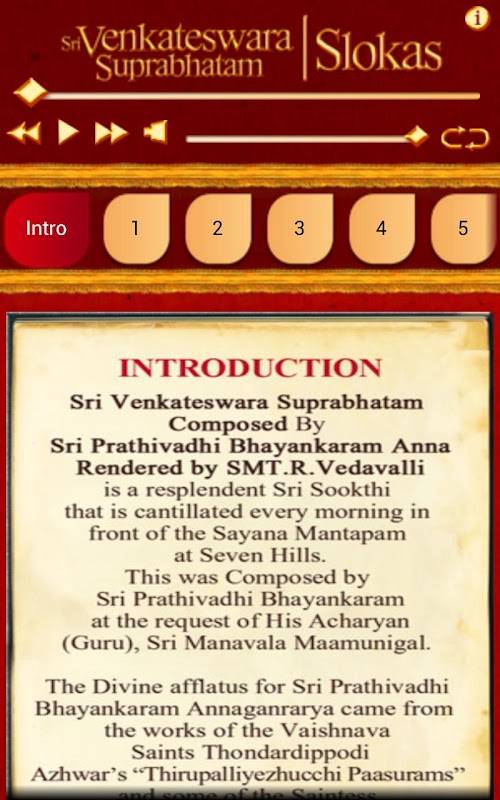 If you are looking to download other versions of Suprabhatam Recital Android App, We have 1 version in our database. Please select one of them below to download.