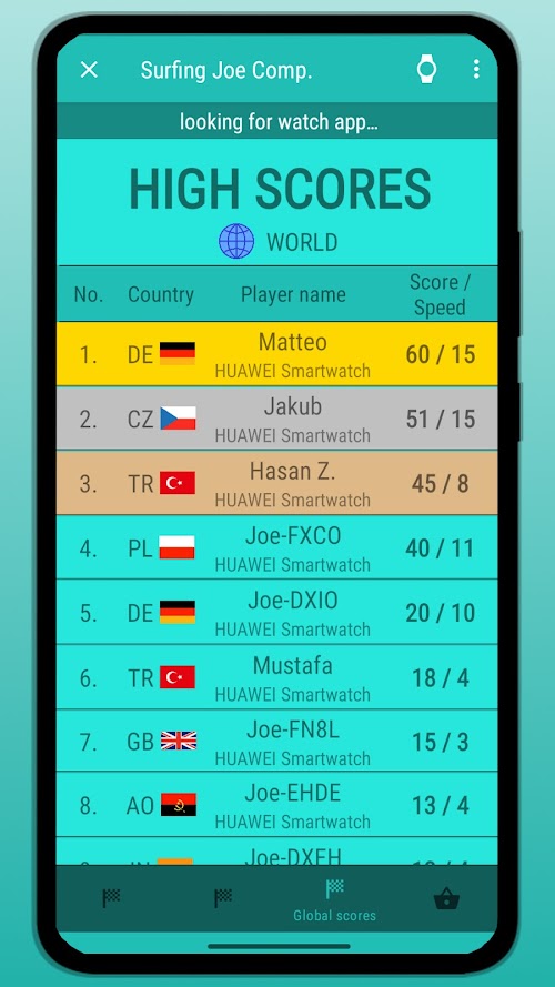 It is companion app for the arcade game called Surfing Joe on HUAWEI smartwatches and sport watches. DO NOT INSTALL IT if you don't have watch from HUAWEI. This app connect to Surfing Joe watch app and get back the best score results from the game. The companion app keeps the best scores and shows rankings for user country and global.