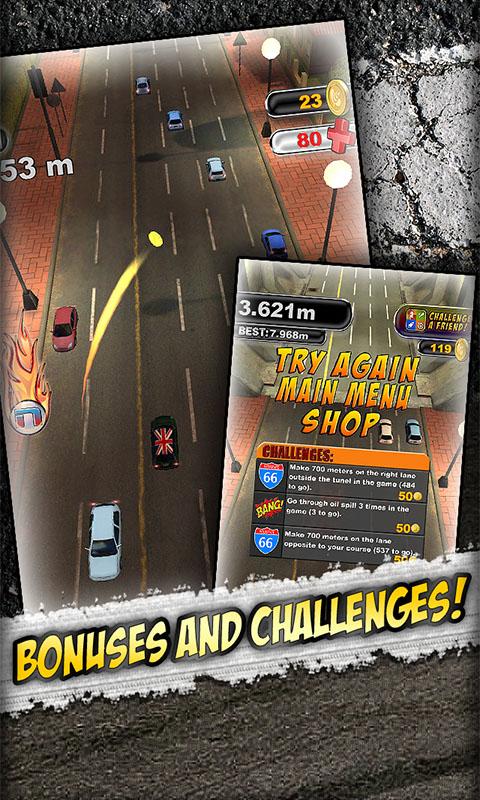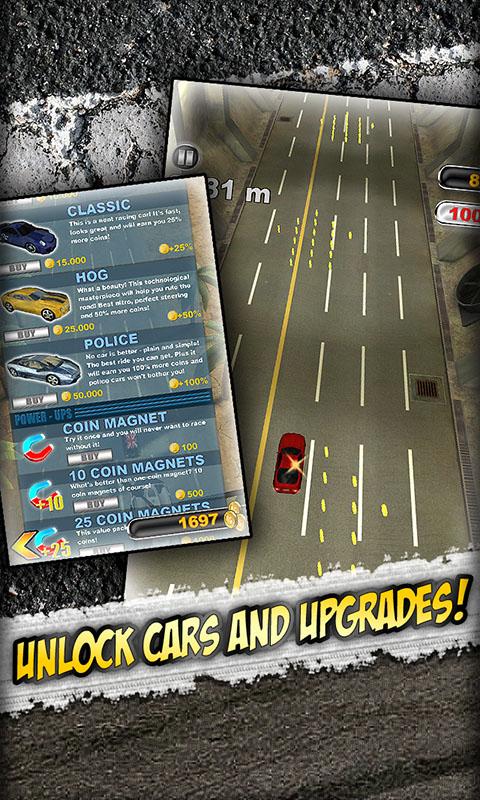 Get rid of all obstacles in your path, use the nitro boost to smash through other cars and to destroy barricades! Buy magnets, multipliers and other bonuses to collect even more coins, and put all your skills to get as far as possible, with utter disregard for the traffic rules! Compete against your friends on the online leaderboards and lose yourself in this awesome high-octane treat!