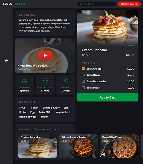 Suzlon is an application where users can select items from various categories such as food, beverages, etc., and can add them to their shopping cart.