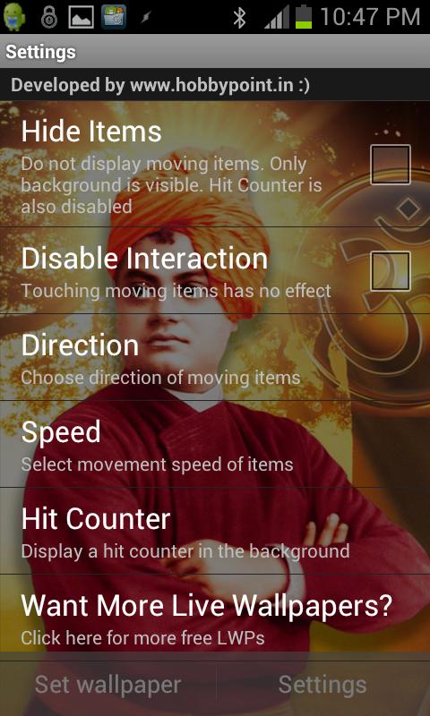 This is a beautiful high quality live wallpaper of Swami Vivekanand. It features Swami Vivekananda with shower of animated flowers, OM, leaves and diyas.