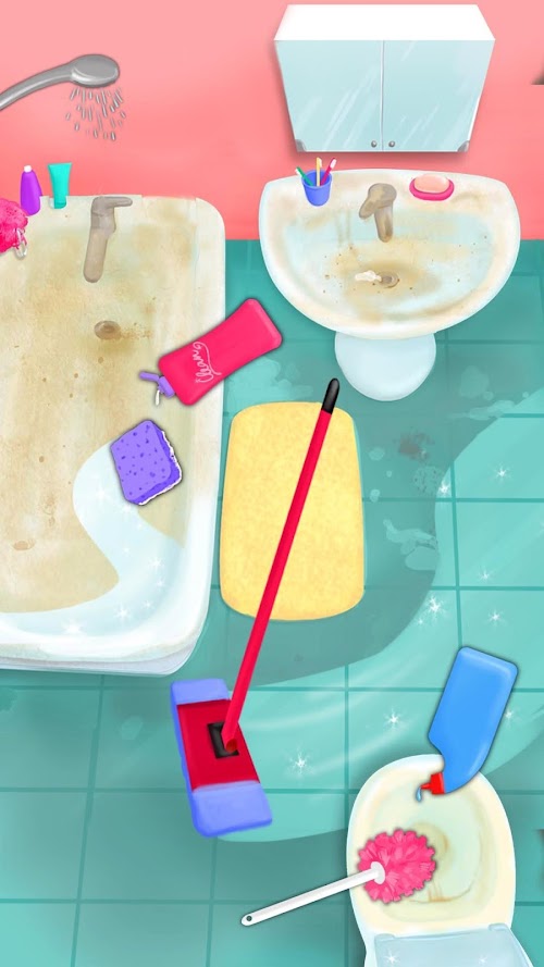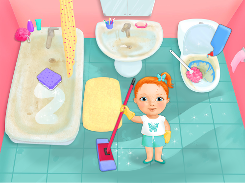 Little Emma will give you a sponge and bathroom cleaner. Scrub the tub and sink, then wash the dirt away. Clean the toilet, mop the floor, and you’re done!