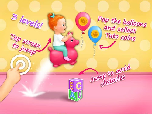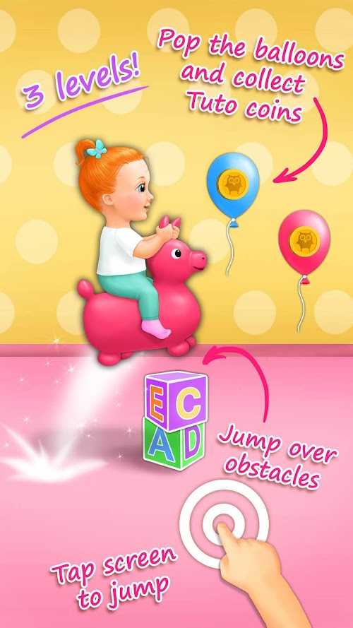 Have tons of bouncy fun hopping on a pink inflatable toy horse across the nursery room! Tap the screen to jump over letter blocks, toys and baby chairs. Collect milk bottles, balloons and hearts!