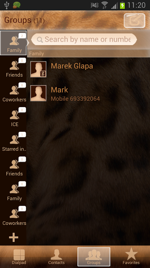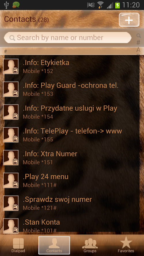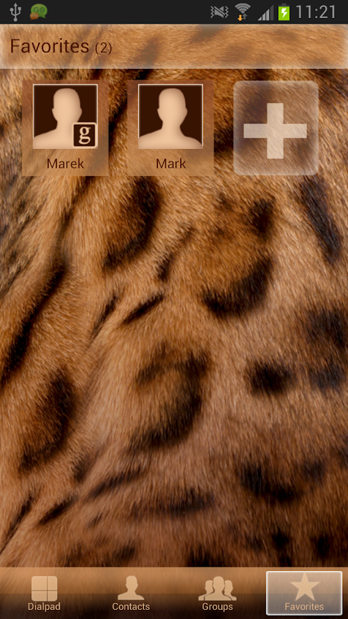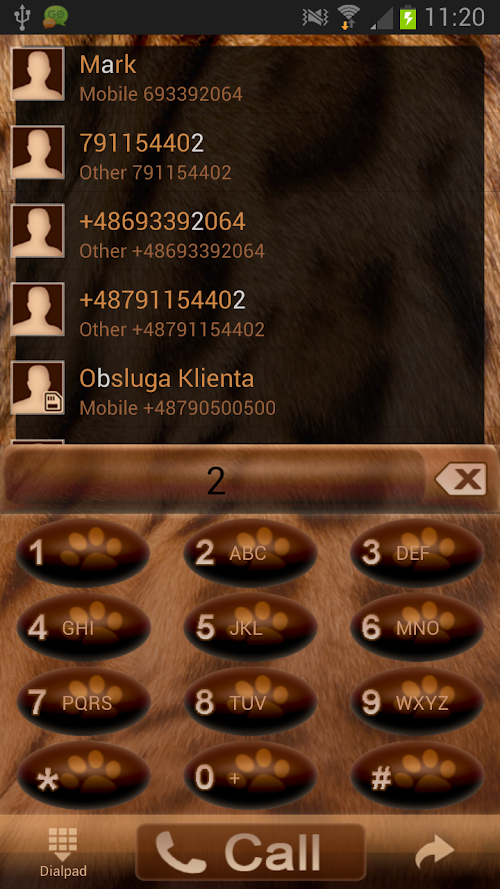 Background of contact list is like leopard skin. Names of contacts, date and clock have shades of brown. Keyboard keys have leopard trace on brown background, numbers and letters are in light brown colour. Button for calling has brown background and inscription in beige colour. Other elements are in shades of brown. Other contact list have also pattern from leopard skin on the background and their components are in the colours of brown. If you like this theme and you want to have it in other applications check out our projects with leopard pattern and download for free. This theme is for those who love nature and animals especially those wild from Africa.
